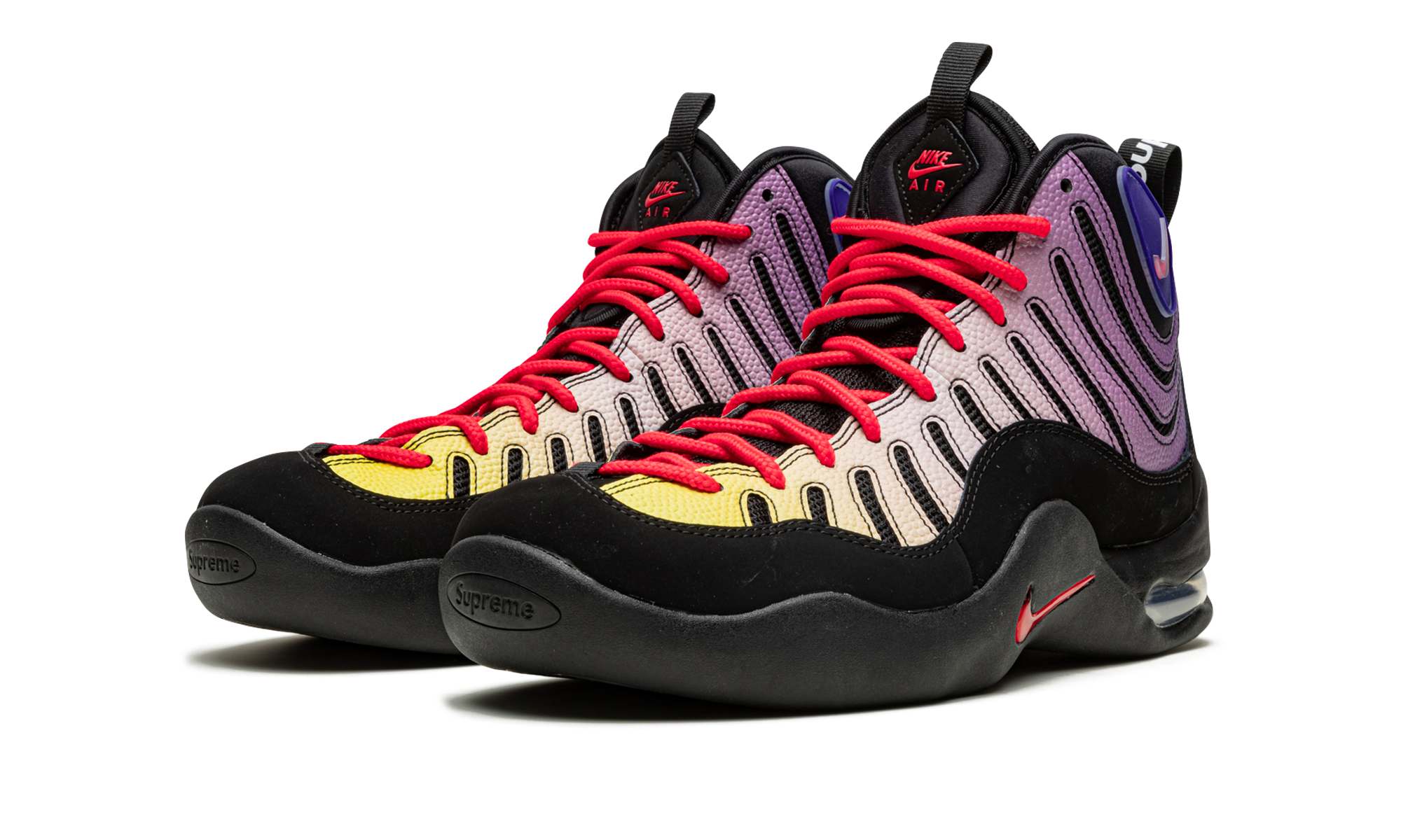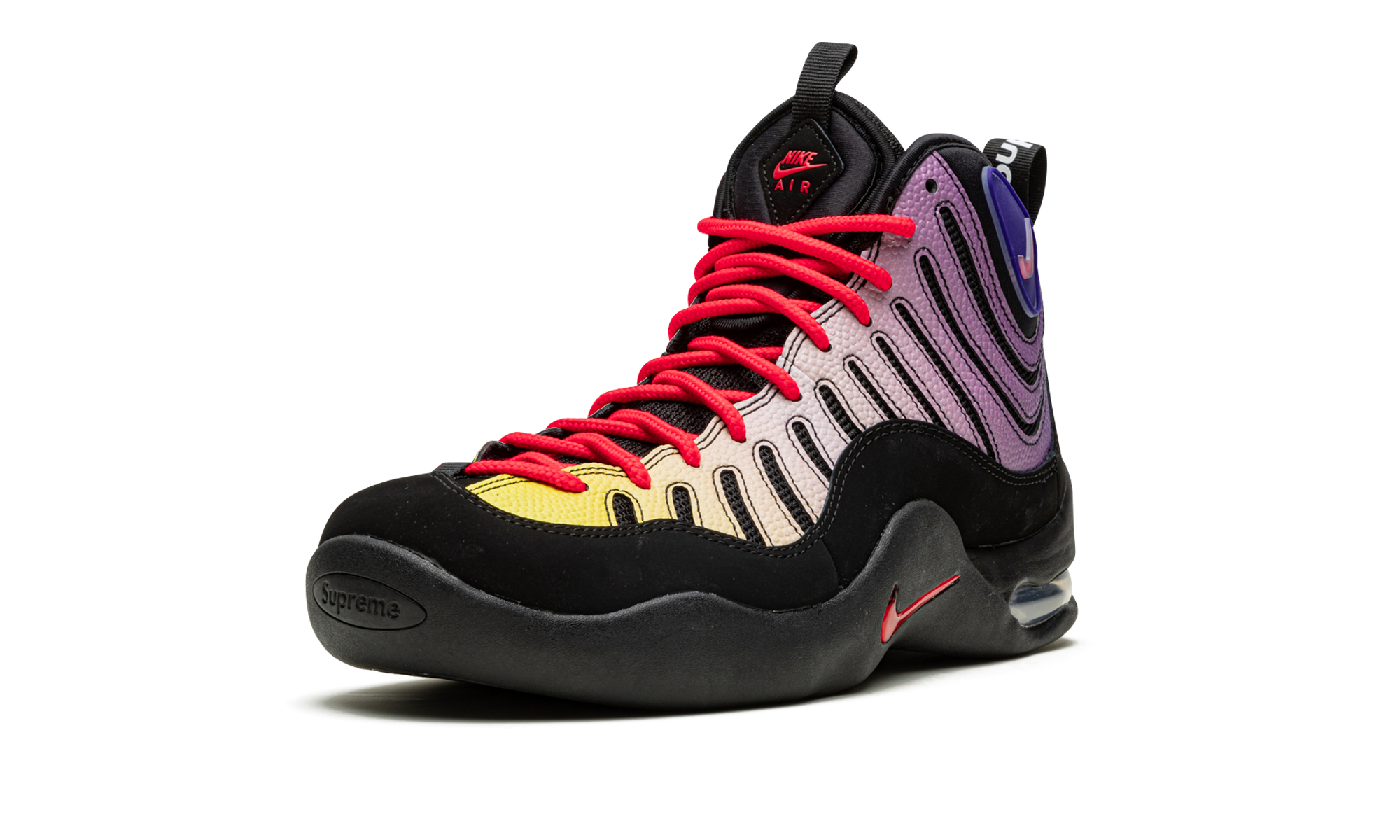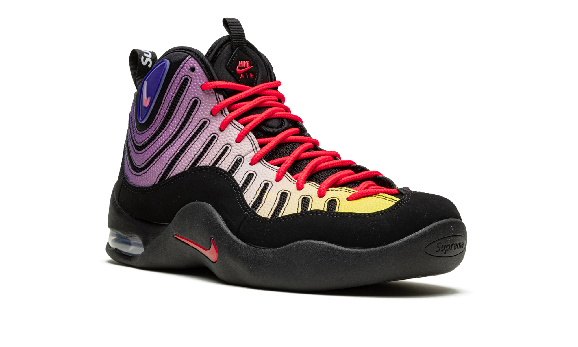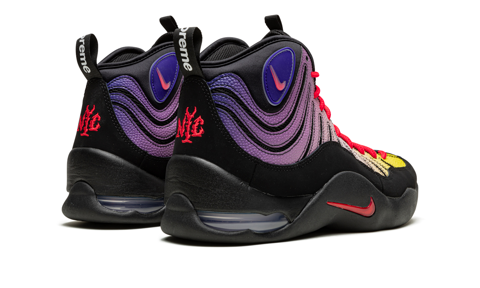 The Supreme x Nike Air Bakin’ SP “Black Gradient” is a collaboration by the “World Famous” streetwear brand on the retro performance basketball shoe that originally debuted in 1997. The Air Bakin’ was worn by Basketball Hall of Famer Mitch Richmond, Tim Hardaway, and others in the NBA back in the day, the “Black Gradient” colorway features a black mesh construction with a lavender to yellow gradient color scheme on the textured leather panels on the sides. A black synthetic nubuck mudguard balances the look. An orange Swoosh can be found on the collar and an orange Jeweled Swoosh appears on the side of the black midsole. An “NYC” logo is found on the heel and “Supreme” detailing dots the black nylon heel tab. Release date: March 2, 2023 Supreme – Black