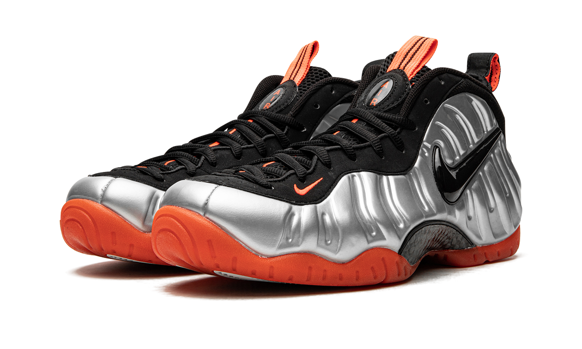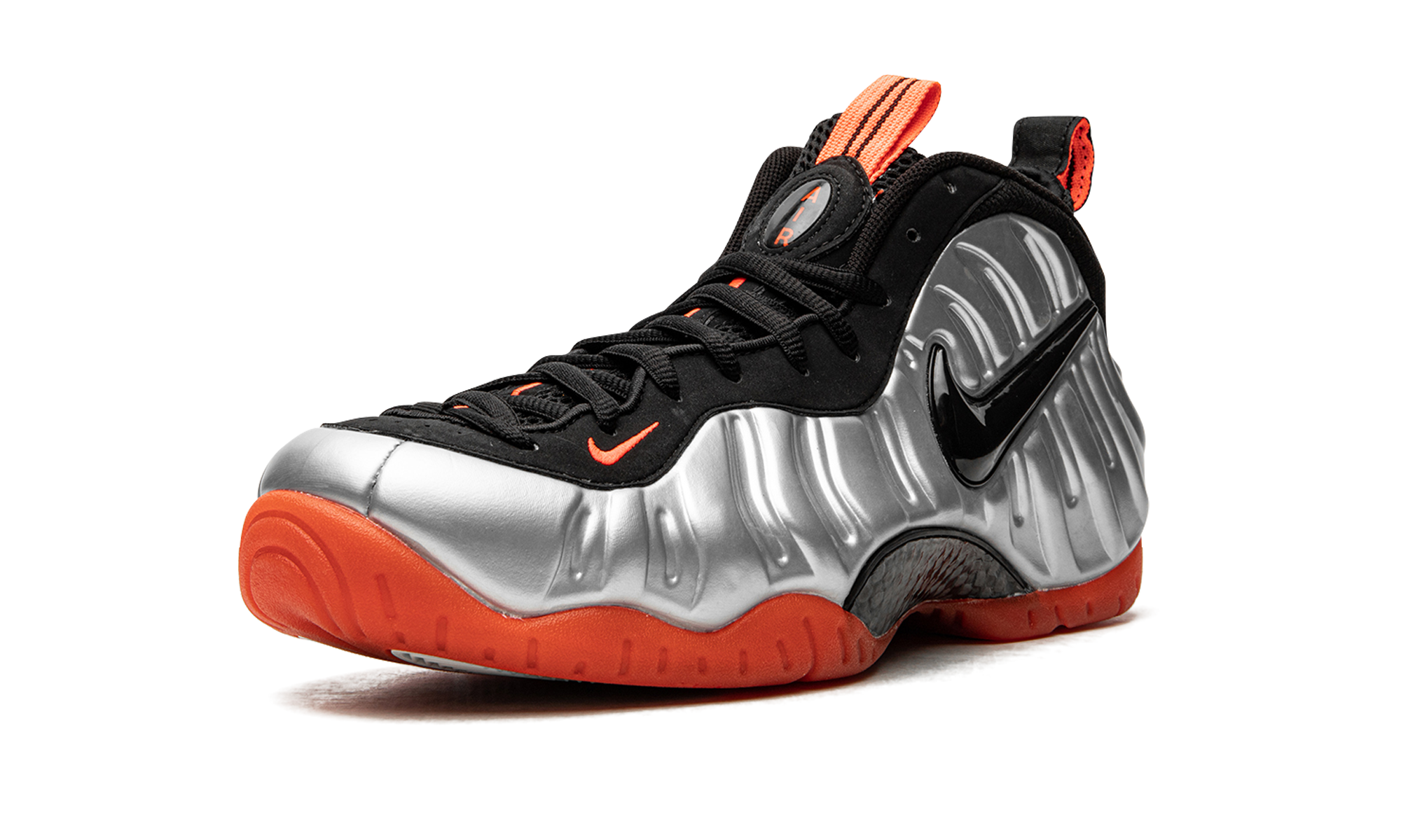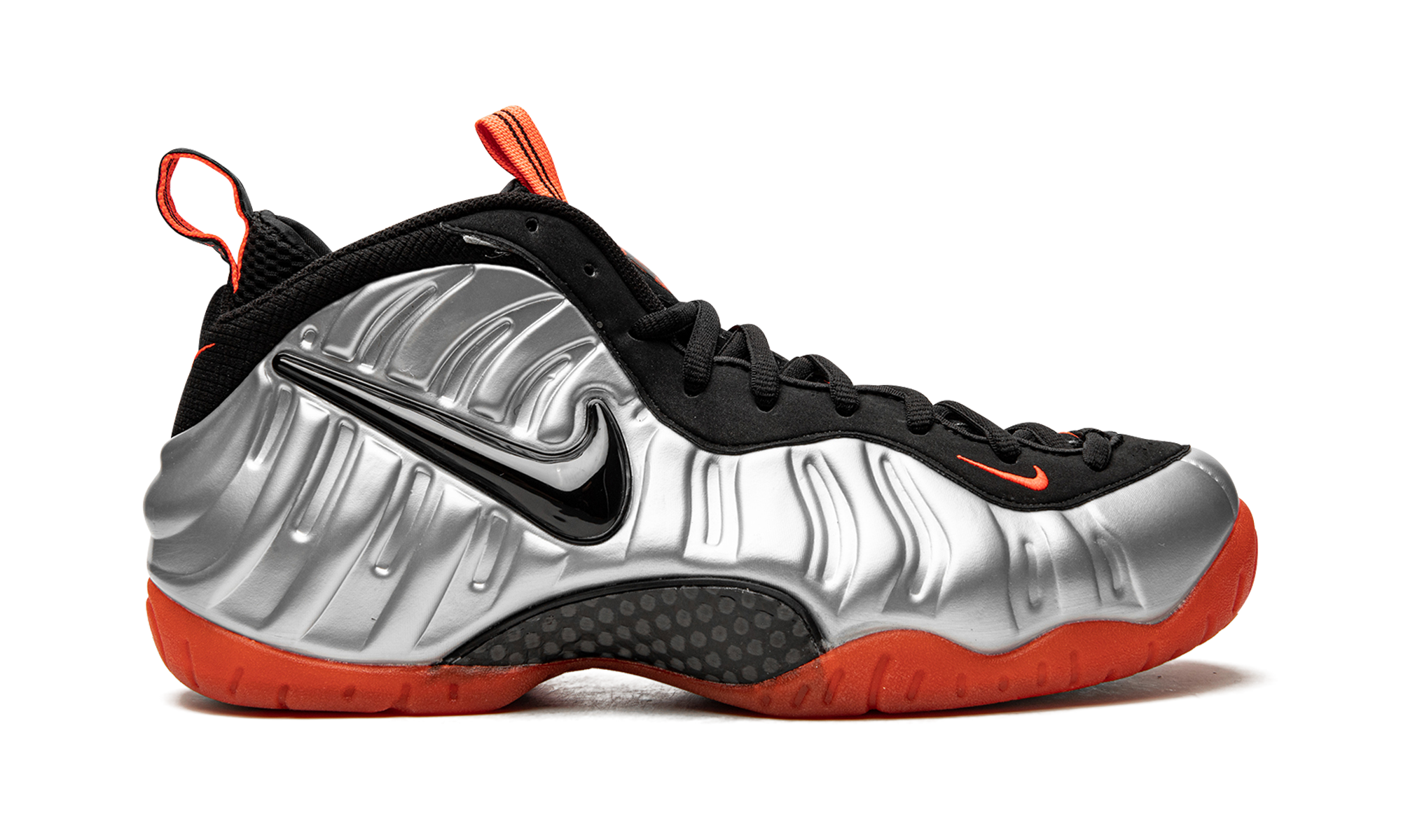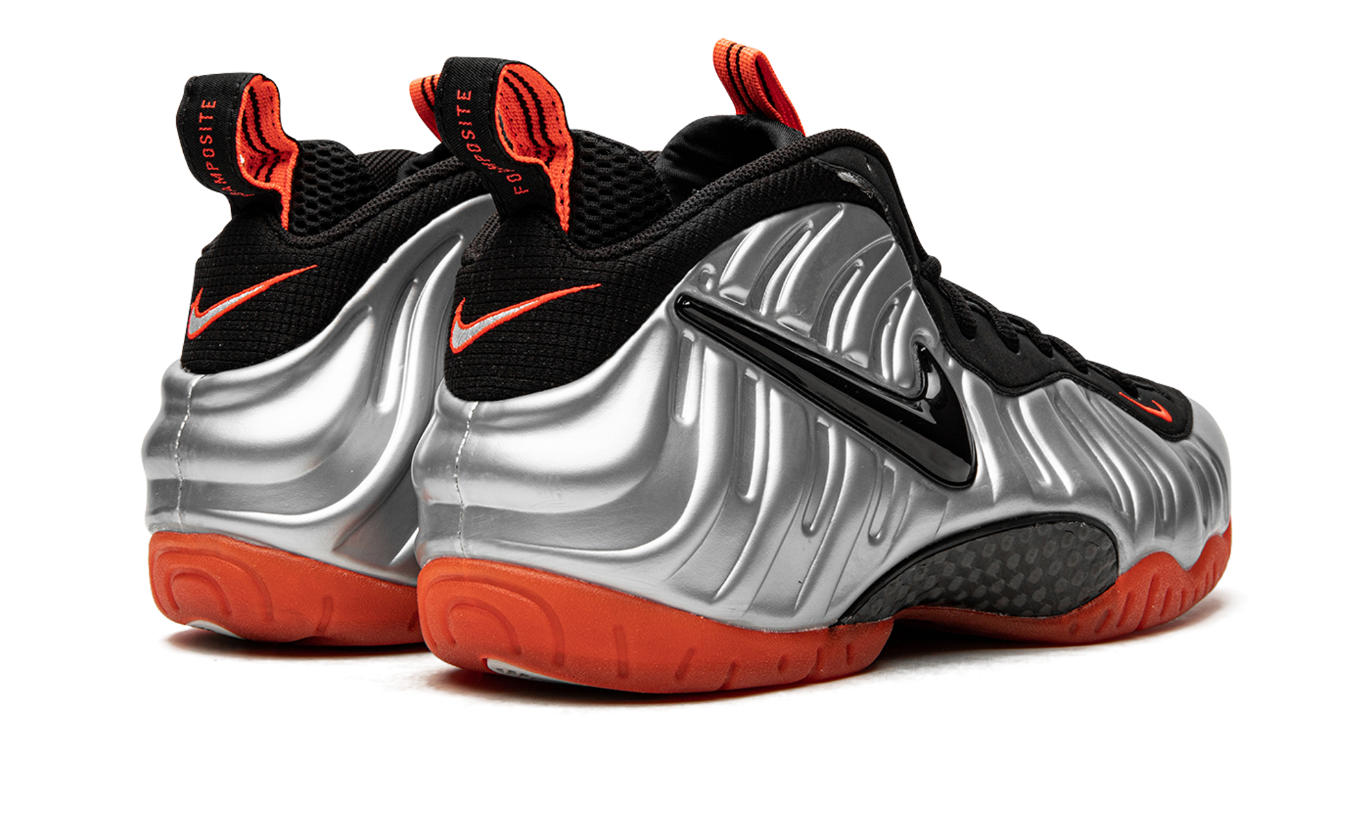 This now-classic colorway of the Nike Air Foamposite Pro from 2012 features an eye-catching metallic platinum Foamposite shell with accents in black and bright crimson. Crimson