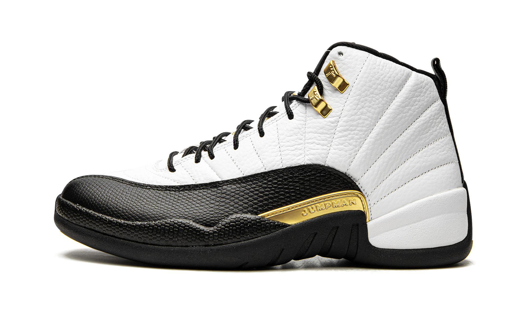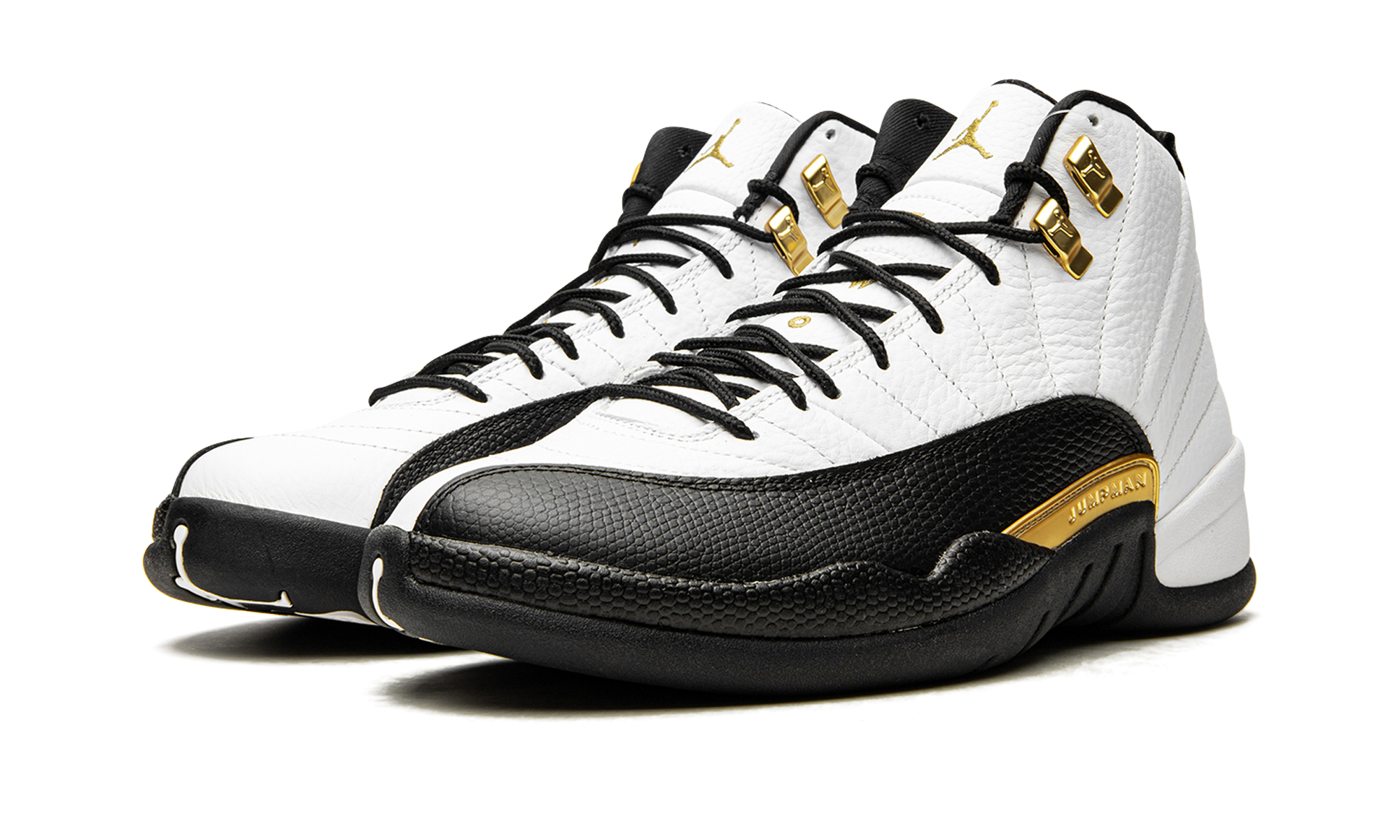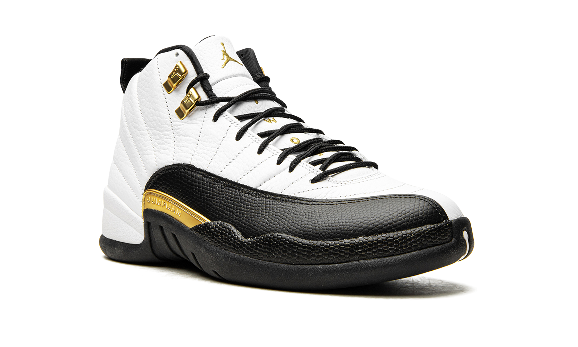 The Air Jordan 12 “Royalty Taxi” is a reimagined version of the original colorway of Michael Jordan’s retro basketball shoe from the late ‘90s that features several new modifications. A Holiday 2021 release by Jordan Brand, the new-look “Royalty Taxi” or “Royalty” mimics the Air Jordan 12’s original white-and-black “Taxi” color block, but with a few notable variations. Instead of a black leather mudguard, per the original design, the mudguard found on the “Royalty” is dressed in black suede. Also, the Jumpman plate above the midsole now appears in gold. Additional gold accenting comes into play on the Jumpman-branded eyelet holders and on the Jumpman and “Two 3” detailing on the white leather tongue, the latter of which were previously seen in black on the first “Taxi” from November 1996. The revised look of the Air Jordan 12 “Royalty” honors the 25-year anniversary of the original “Taxi” release. Release date: November 13, 2021 Royalty Taxi