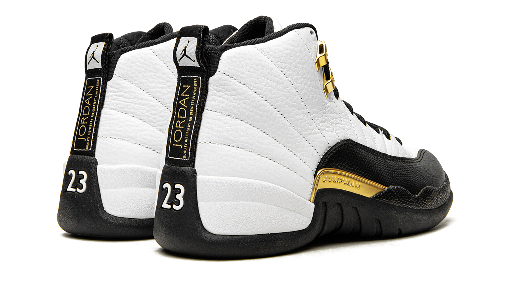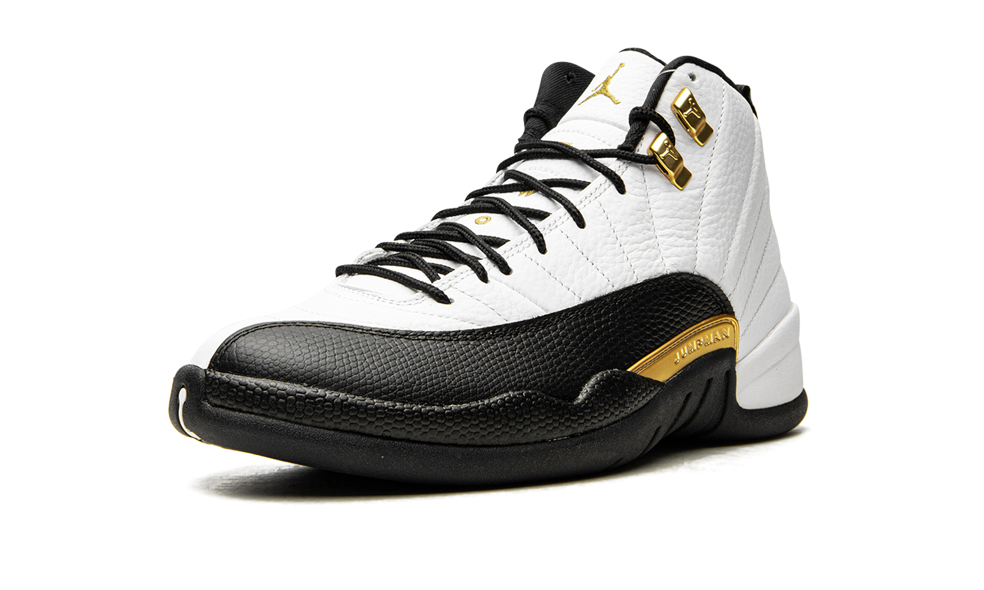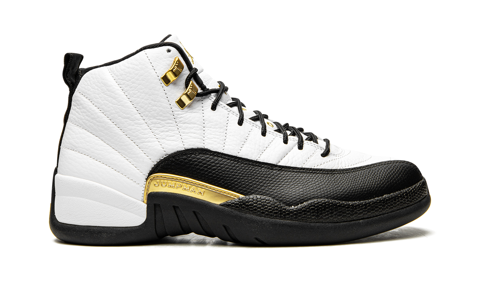 The Air Jordan 12 “Royalty Taxi” is a reimagined version of the original colorway of Michael Jordan’s retro basketball shoe from the late ‘90s that features several new modifications. A Holiday 2021 release by Jordan Brand, the new-look “Royalty Taxi” or “Royalty” mimics the Air Jordan 12’s original white-and-black “Taxi” color block, but with a few notable variations. Instead of a black leather mudguard, per the original design, the mudguard found on the “Royalty” is dressed in black suede. Also, the Jumpman plate above the midsole now appears in gold. Additional gold accenting comes into play on the Jumpman-branded eyelet holders and on the Jumpman and “Two 3” detailing on the white leather tongue, the latter of which were previously seen in black on the first “Taxi” from November 1996. The revised look of the Air Jordan 12 “Royalty” honors the 25-year anniversary of the original “Taxi” release. Release date: November 13, 2021 Royalty Taxi