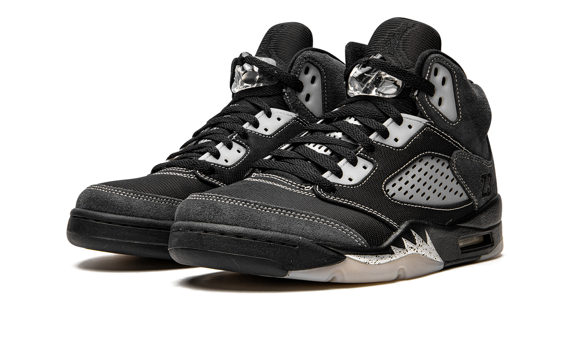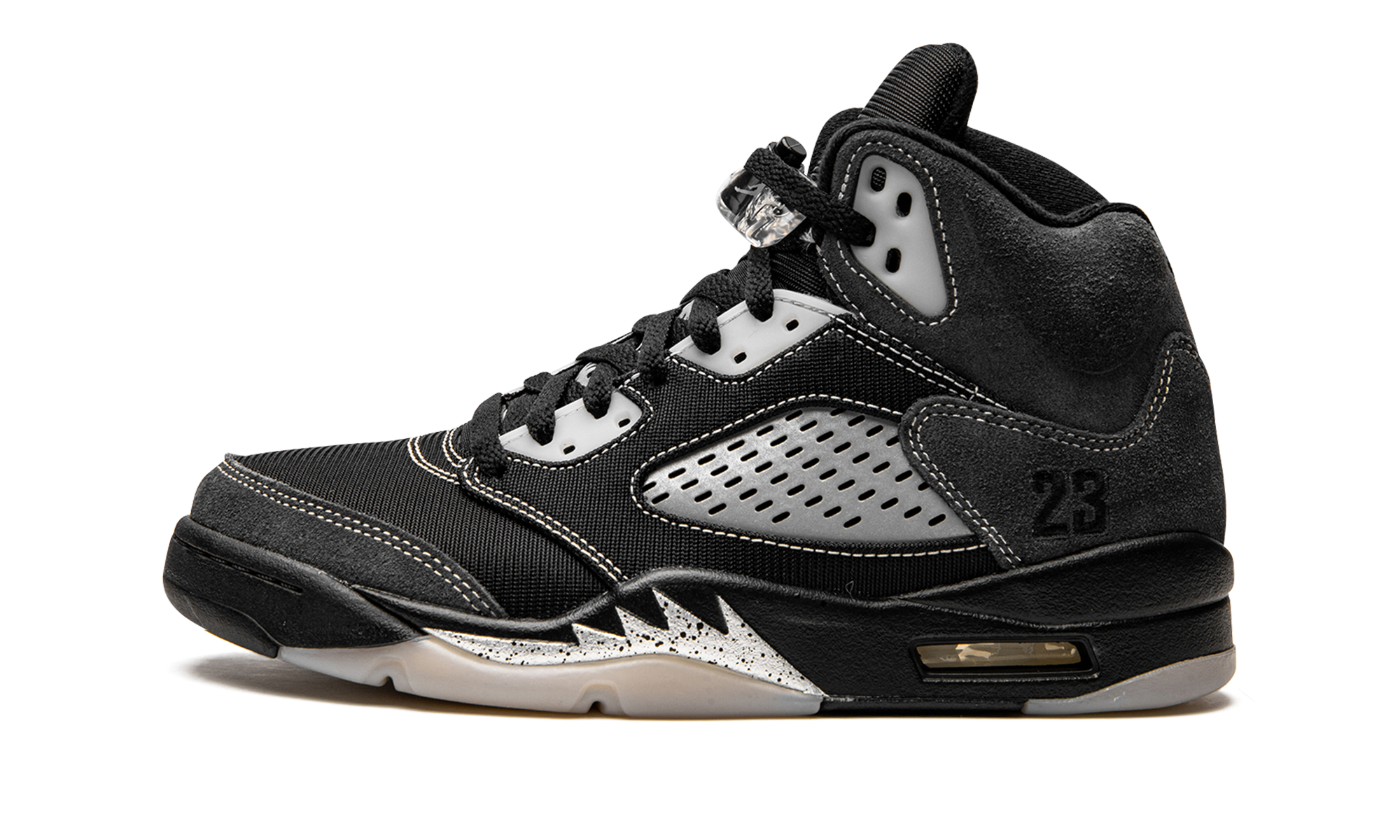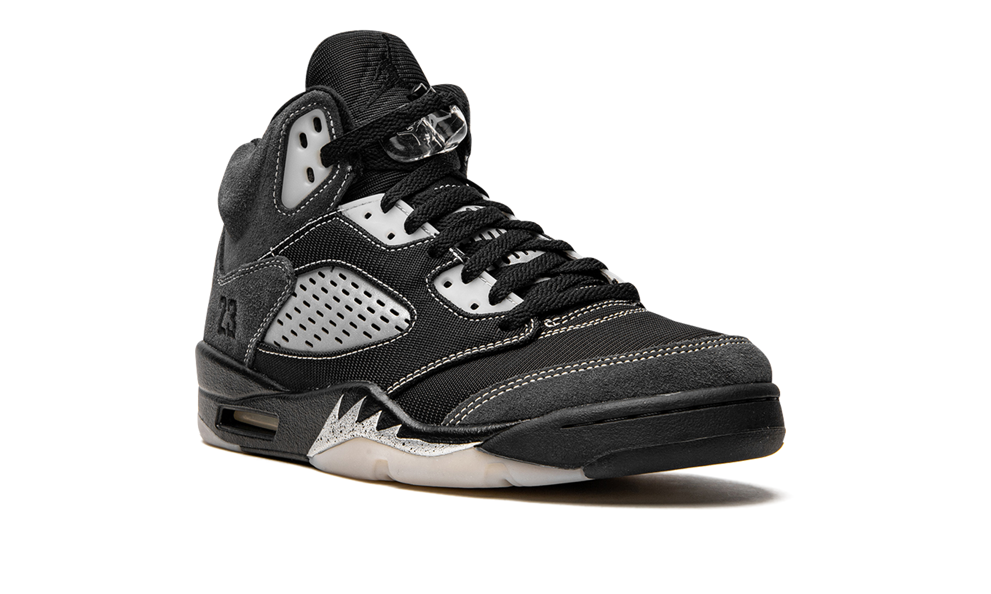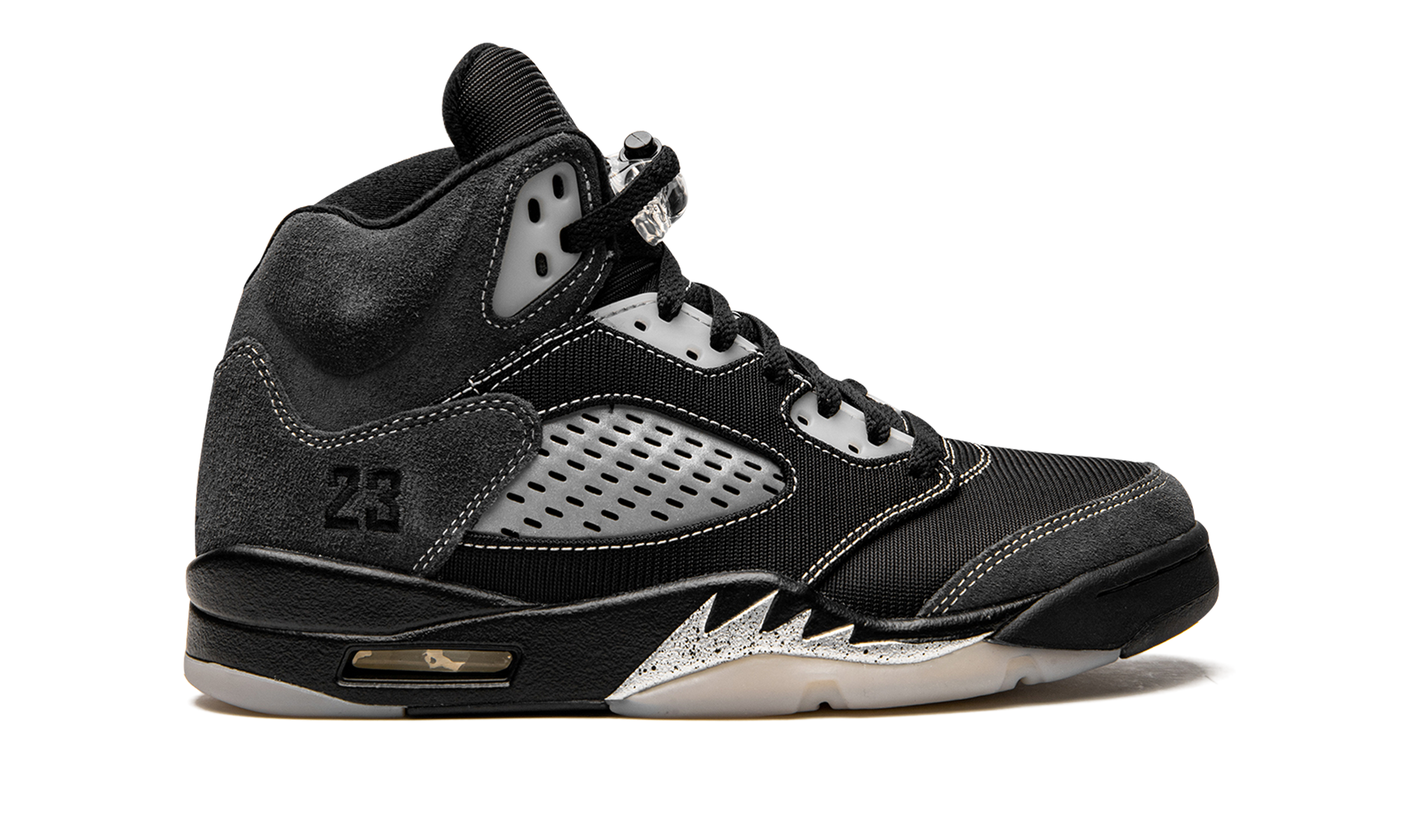 The Air Jordan 5 “Anthracite” is a recontextualized design of Michael Jordan’s fifth signature shoe that features reflective panels. This February 2021 release switches up the look of the all-time classic Jordan 5 silhouette by employing the reflective material typically found on the tongue to the clear netting on the bottom of the tongue and the mid-panel. Elsewhere, Jordan Brand places soft black mesh on the toe, mid-panel, and eyelets. Plush Anthracite or grey suede detailing is located on the collar, quarter panel, and toe cap. White contrast stitching outlines the aforementioned panels. The tonal embroidered “23” branding found on the heel is in reference to the original Player Exclusive version of the Air Jordan 5 worn by Michael Jordan with the Chicago Bulls in 1991. A black Jumpman logo appears on the black mesh tongue, on the back of the shoe, and on the insole. Silver shark tooth detailing highlights the black midsole to complete the look. Release date: February 6, 2021. Anthracite