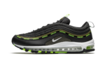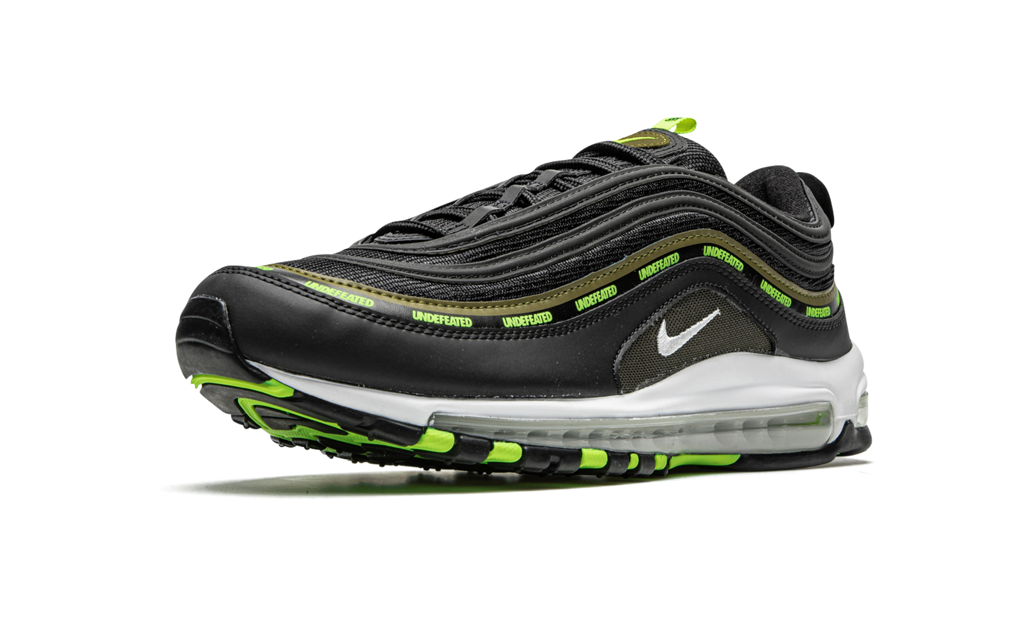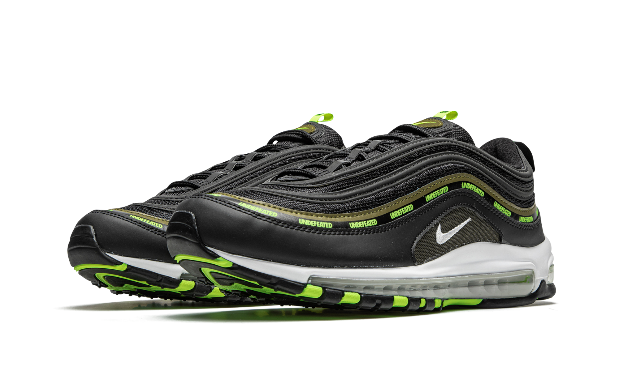 The Undefeated x Nike Air Max 97 “Black/Volt” is one of two Holiday 2020 colorway of the late-90s performance runner produced in collaboration between the Los Angeles based retailer and Nike. The “Black/Volt” is yet another strong addition to Undefeated’s storied catalog of hype-inducing Air Max 97 colorways. Following looks such as the “Olive” and “Black” designs from 2017, the “Black/Volt” is a desirable shoe for fans of streetwear and Air Max shoes. Its look consists of reflective black wavy panels layered over a tonal mesh base. A Midwest Gold panel appears above a panel that features Volt colored Undefeated text. The same hue of Midwest Gold can be found on the circular synthetic overlay with neon green Swoosh branding stitched onto the black mesh tongue. A small white embroidered Swoosh can be found on the mesh panel in the middle of the mudguard. Full-length visible Air cushioning technology appears underfoot beneath the white midsole. Undefeated – Black Volt