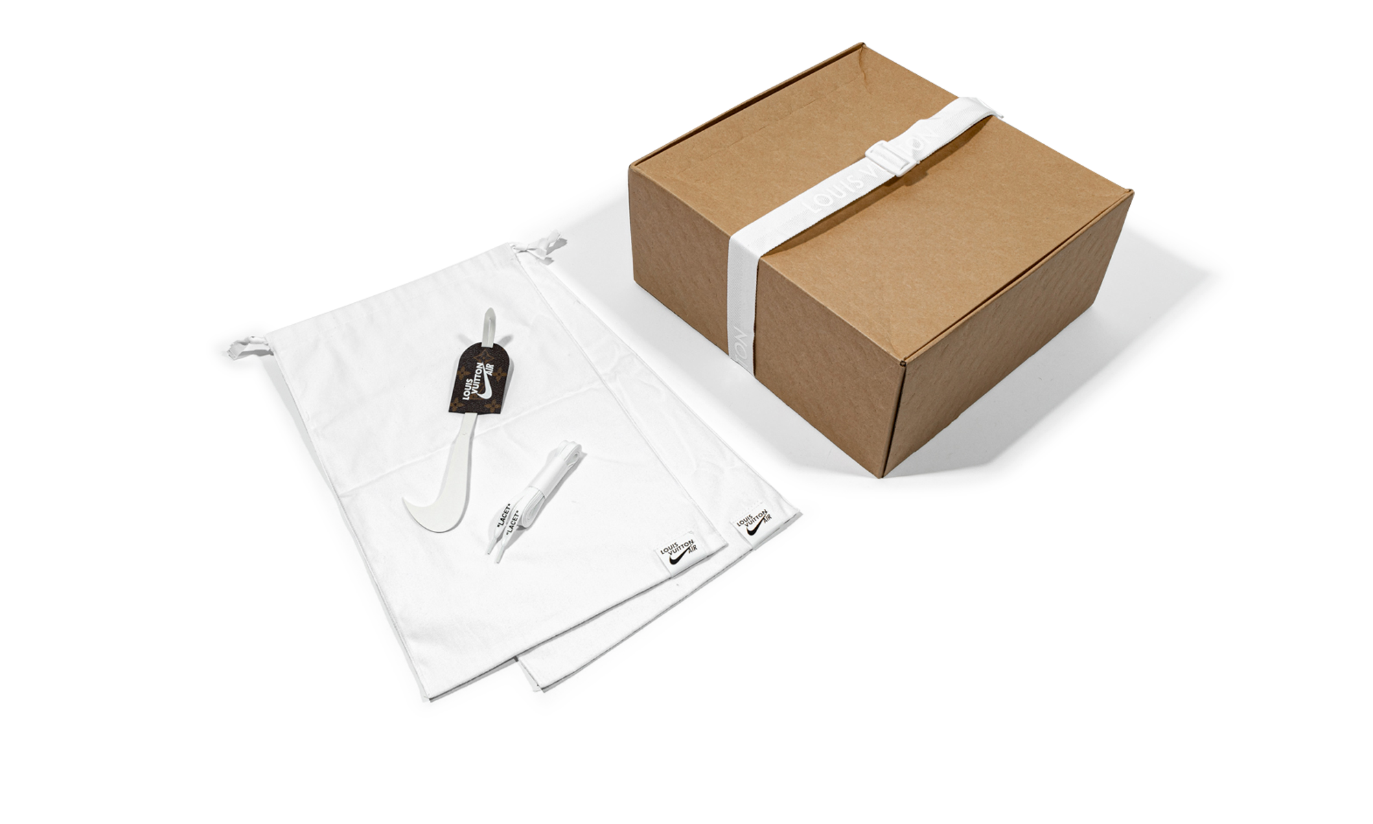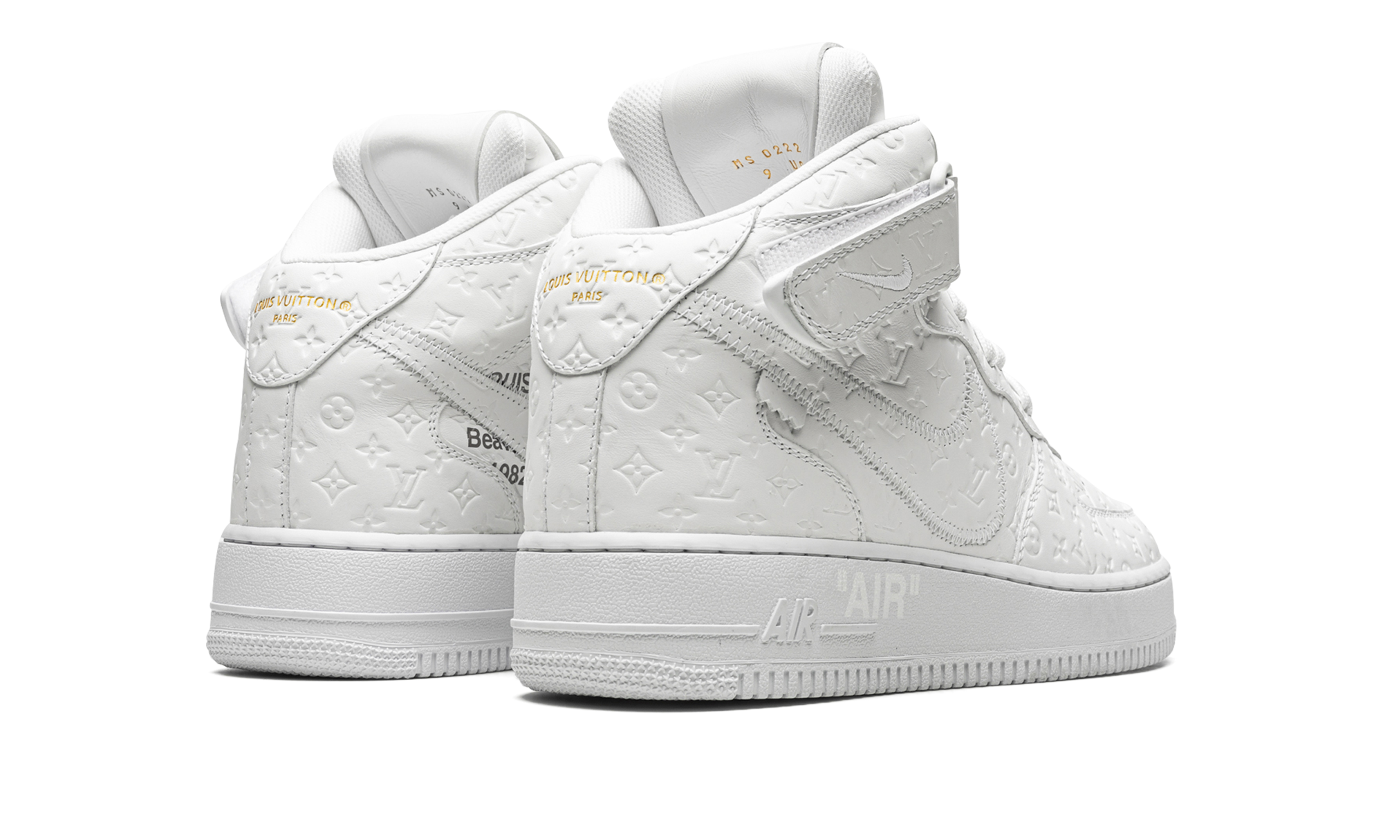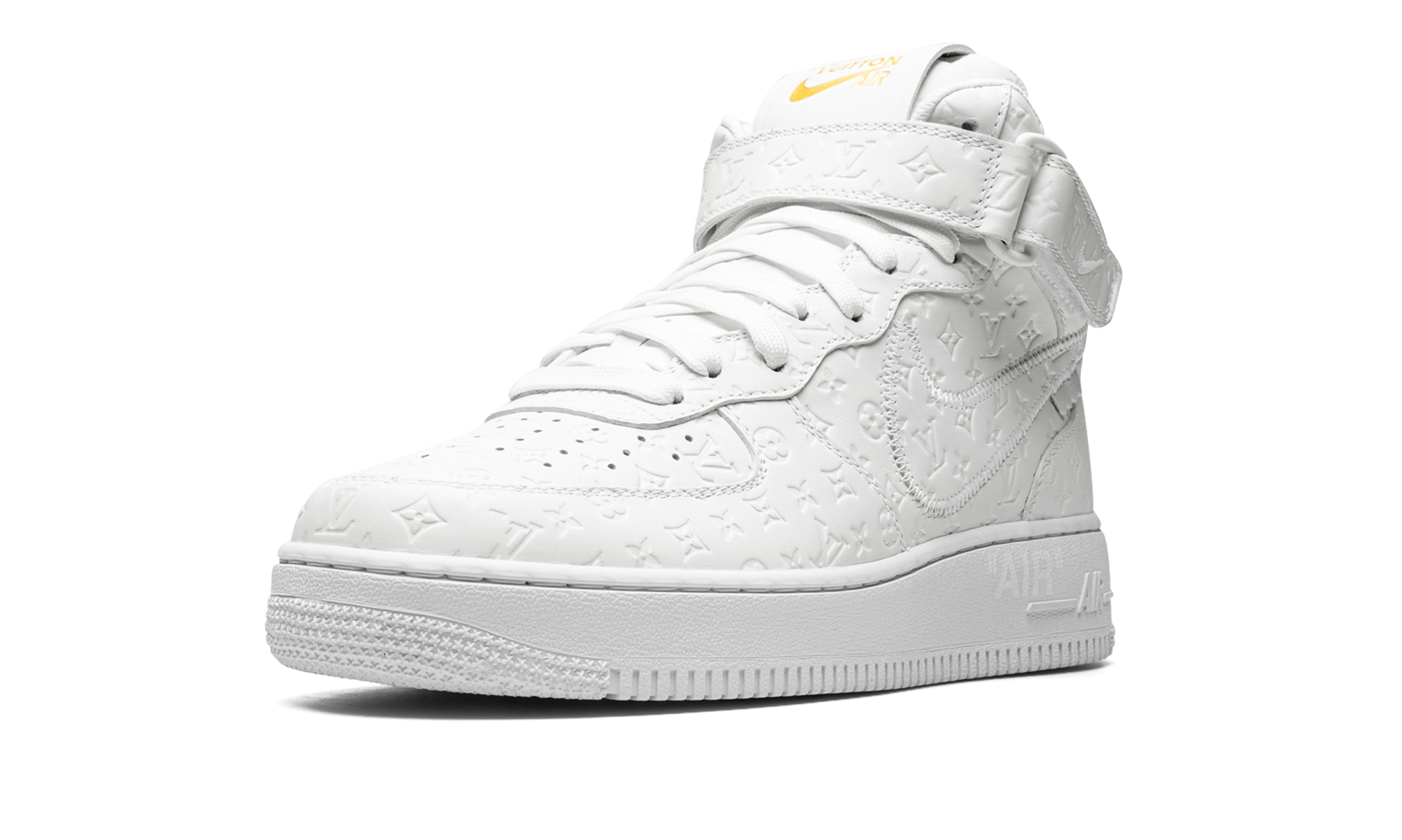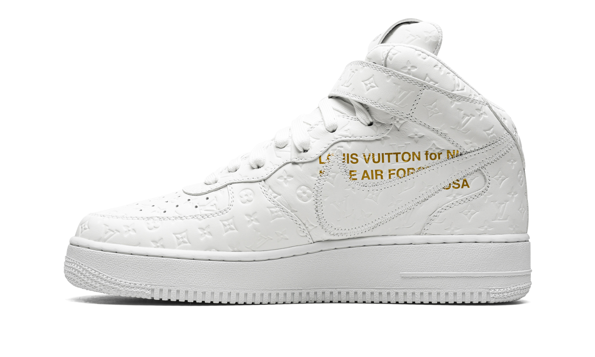 The Louis Vuitton x Nike Air Force 1 Mid “Triple White” is the coveted monochromatic white colorway included in the collaboration by the storied high fashion brand that was directed by the late Virgil Abloh. The “Triple White” is one of multiple colorways of the Air Force 1 produced by Louis Vuitton, Nike, and Abloh in 2022, and one of the most desirable releases of the year, as well. As for the shoe’s design, it features a monochromatic white leather upper with Louis Vuitton’s famous monogram print stamped into the material. A stitched Swoosh outline appears on either side of the shoe. Other design elements include a reworked “Louis Vuitton Air Force 1” logo on the side of the tongue and a white tab on the lateral side of the Swoosh on the mid-panel. The shoe rides on a brown rubber sole. Made in Italy. Virgil Abloh – White/White
