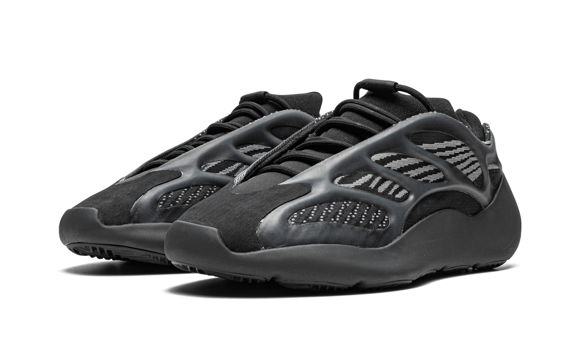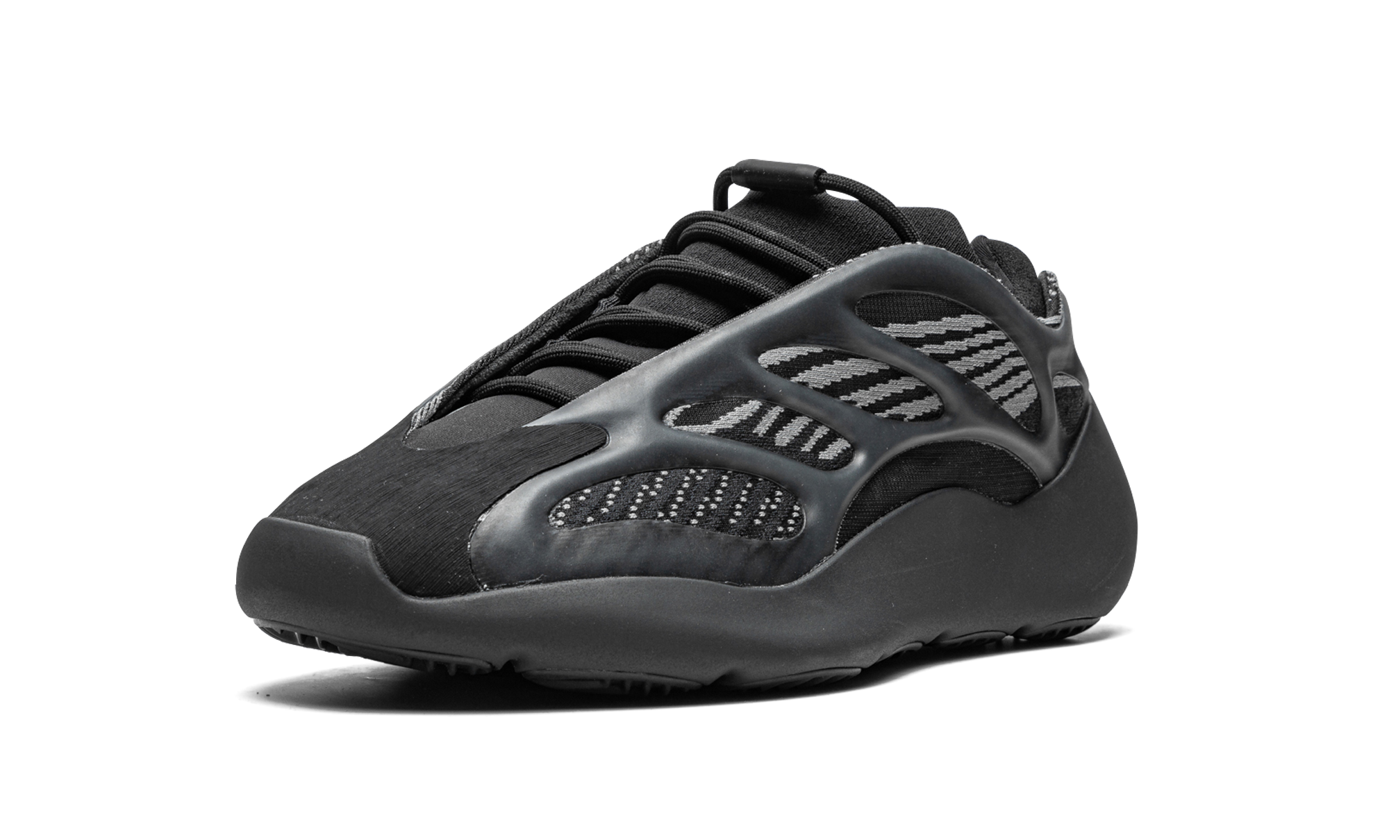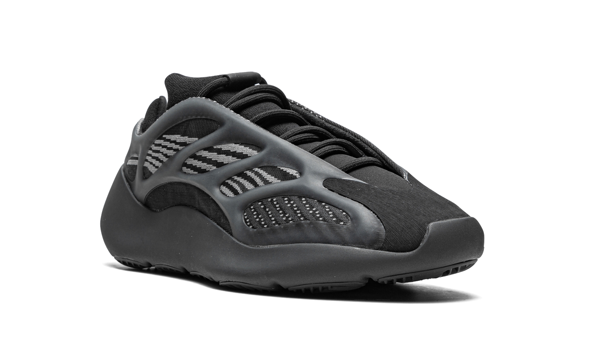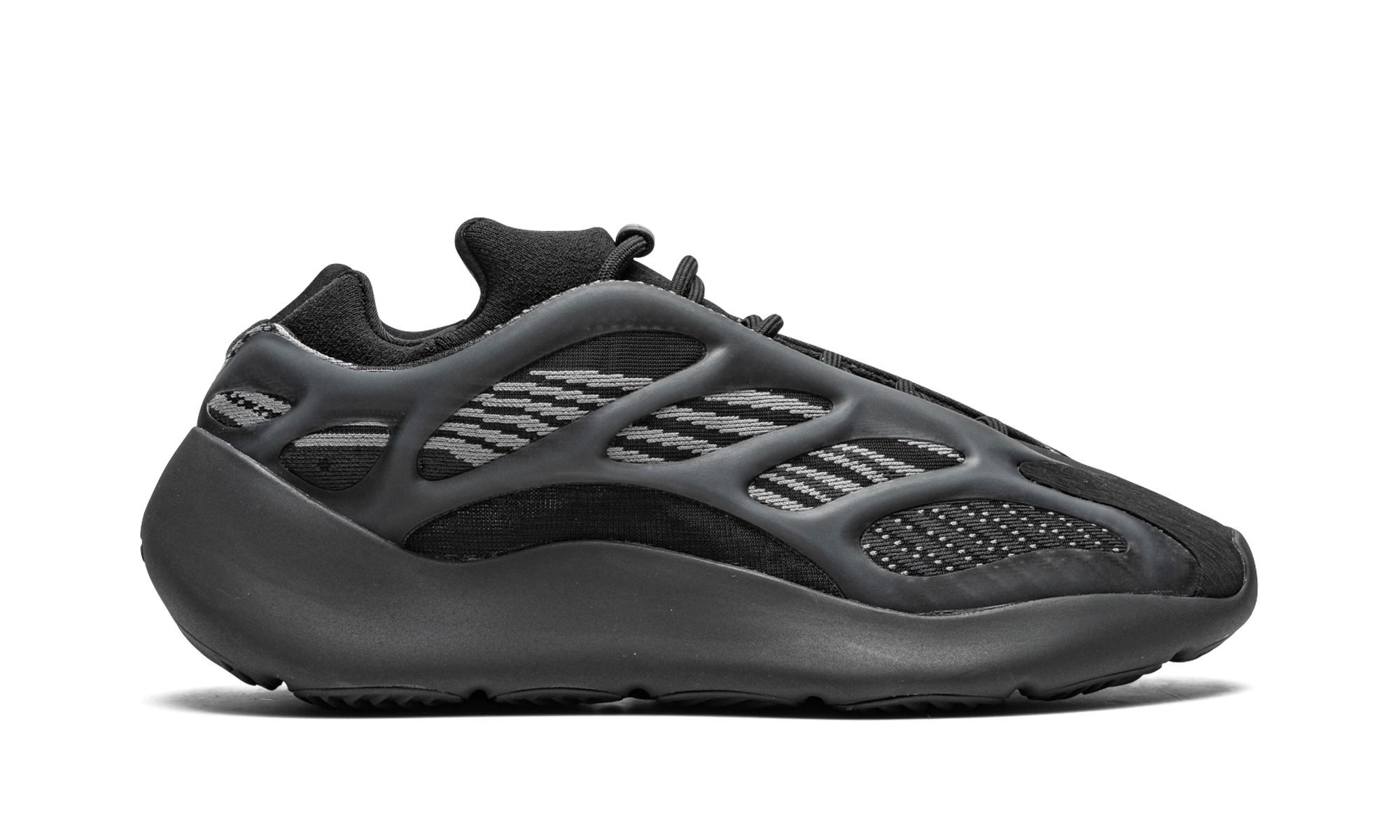 The adidas Yeezy 700 V3 “Dark Glow” is a mostly monochromatic black colorway of the evolutionary shoe by Kanye West and adidas that was released in August 2021. Included in West’s Yeezy Day celebration, the “Dark Glow” is similar to the “Alvah” colorway that adidas debuted in April 2020, save for the newly implemented glow-in-the-dark RPU overlays layered over the “Dark Glow’s” black Primeknit base. Contrasting grey monofilament stripes appear on both sides of the knit upper. Underfoot, adidas replaces the Boost cushioning found in many 700 styles for a lightweight EVA foam composition. Release date: August 2, 2021 Dark Glow